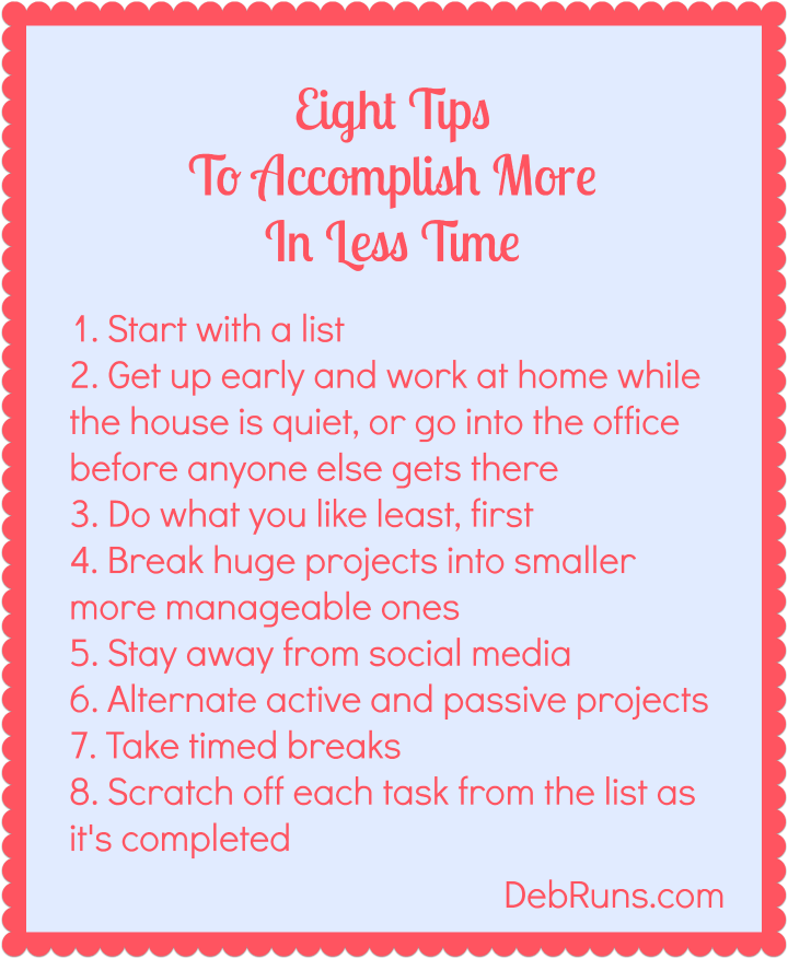 I’ve narrowed down what I’ve found to work best for me into eight tips for how to accomplish more in less time: