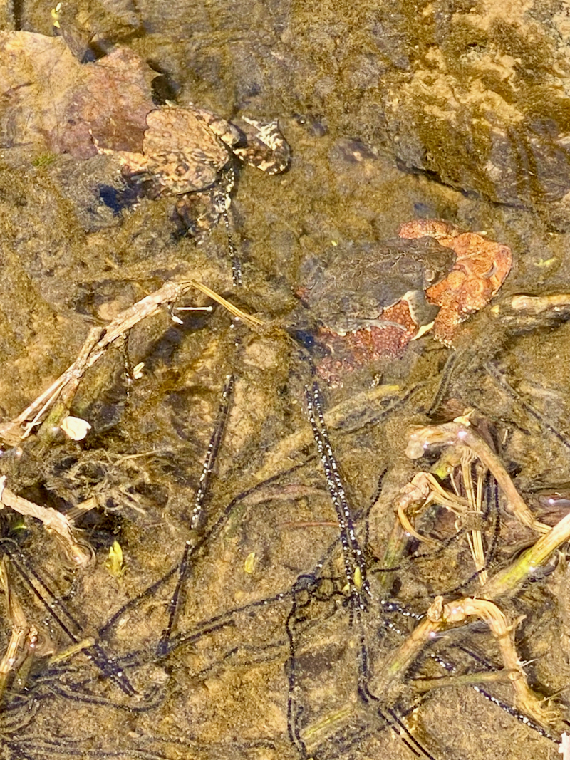 I’d mention that, speaking of a mating frenzy in our backyard, in early April we were entertained by the amorous calls of toads in the creek behind our house. The sound was so loud we could hear it at night even with our windows closed. One day while doing yard work next to the creek, I was surprised by what I saw. There were dozens of couples right next to each other, all getting a little action.